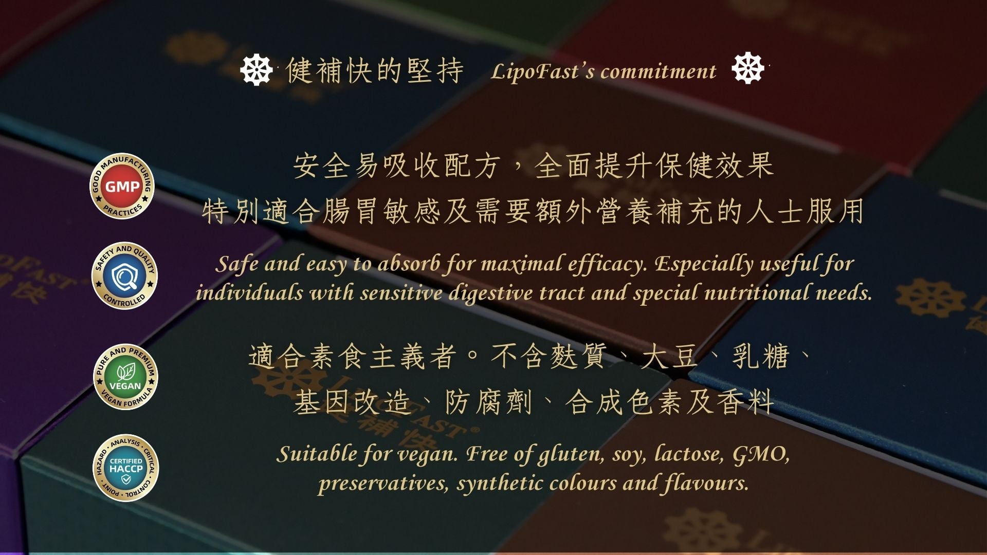 Suitable for vegan. Free of gluten, soy, lactose, GMO, preservatives, synthetic colours and flavours.